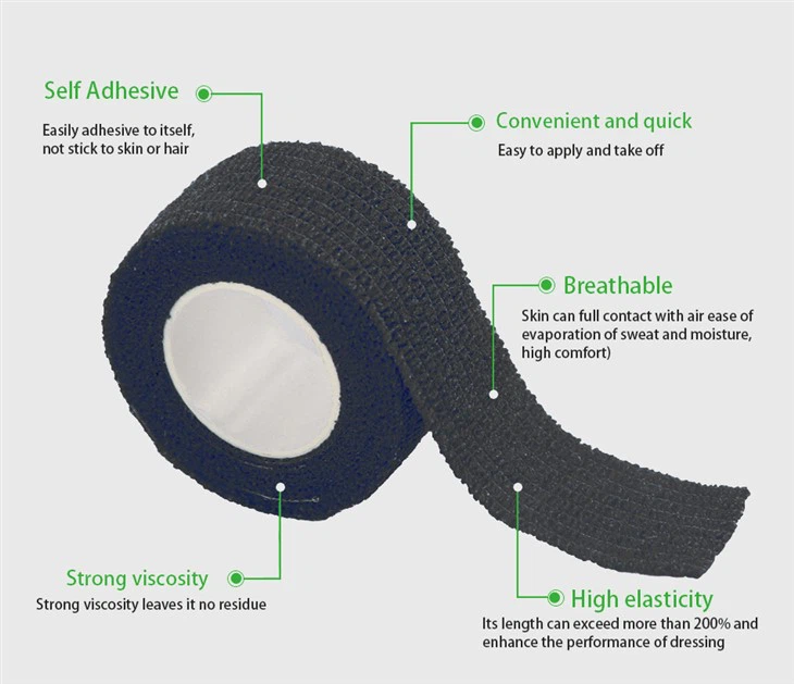 Le bandage collant noir est fait de tissu élastique de haute qualité, recouvert d'une couche de particules de polymère naturel des deux côtés du tissu élastique, et traitées par un certain processus. Le produit noir de bandage adhésif ne s'en tient pas aux cheveux, à la peau, aux vêtements et ne tombe pas en cas de sueur. Les bandages élastiques auto-adhésifs devraient avoir un éclat uniforme, des incisions propres, aucune odeur, des taches et des terrifiants exposés; La force de rupture ne doit pas être inférieure à 10 n / cm; L'auto-adhésivité ne doit pas être inférieure à 3N / cm; L'allongement ne devrait pas être inférieur à 50%; Aucune irritation cutanée. Le produit est fait de tissu de coton pur recouvert de latex adhésif ou naturel sensible à la pression médicale, de tissu non tissé, de patch Kinesio, de tissu élastique, de gaze dégraissant médical, de tissu élastique non tissé et de matériaux composites en caoutchouc naturel. Il s'agit également d'un produit idéal pour habiller les patients en orthopédie, chirurgie générale, orthopédie et maladies vasculaires.